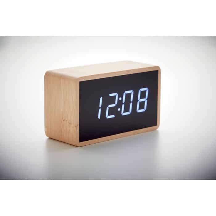 Beli LED prikazovalnik časa z budilko in prikaz temperature v ohišju iz bambusa. Priložen 2-polni adapter AC-DC. Ni primeren za uporabo v Združenem kraljestvu. Bambus je naraven izdelek, lahko pride do rahlih sprememb v barvi in velikosti posameznega predmeta, kar lahko vpliva na končni rezultat dekoracije.